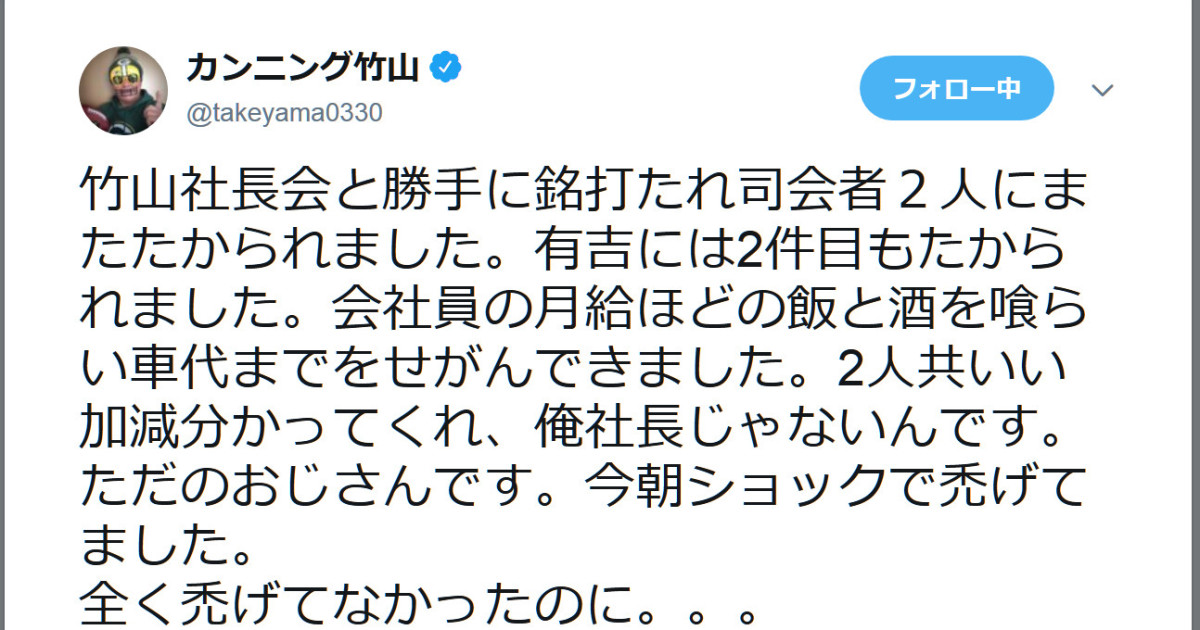 疑惑再燃 カンニング竹山さん 有吉さんと渡部さんにたかられた 腹いせ にしょうもないウソをつく ロケットニュース24 ニュートピ Twitterで話題のニュースをお届け