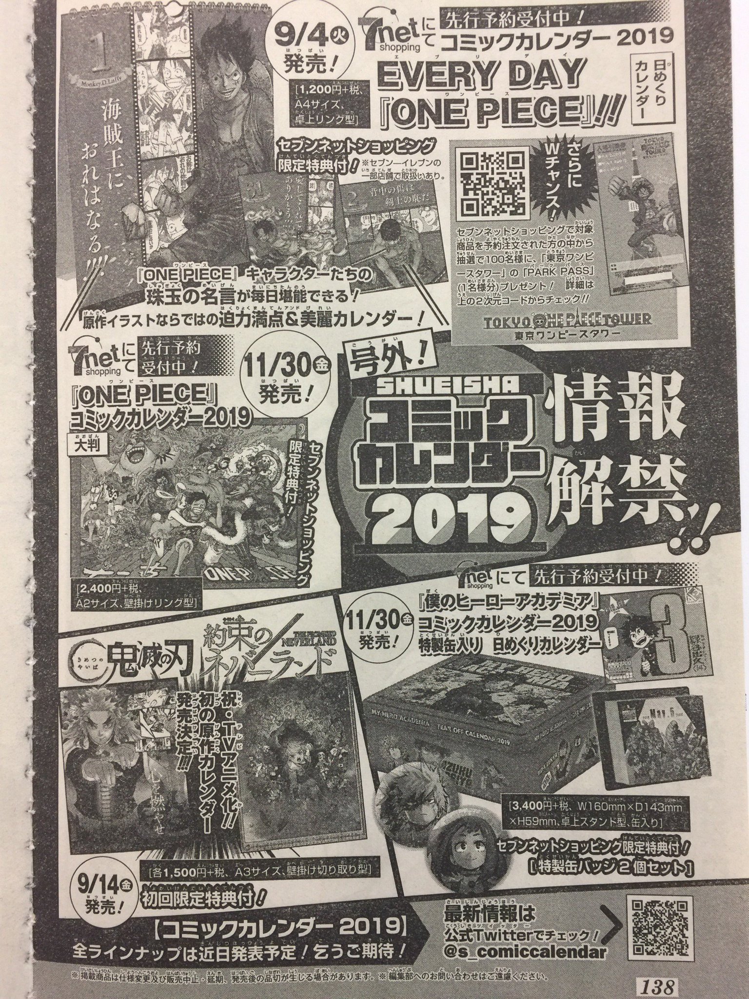 Uzivatel 集英社コミックカレンダー 公式 Na Twitteru コミックカレンダー2019 ついに 情報解禁です 9 4発売 One Piece 万年日めくりカレンダー 9 14発売 約束のネバーランド 鬼滅の刃 A3カレンダー 11 30発売 受注販売 One