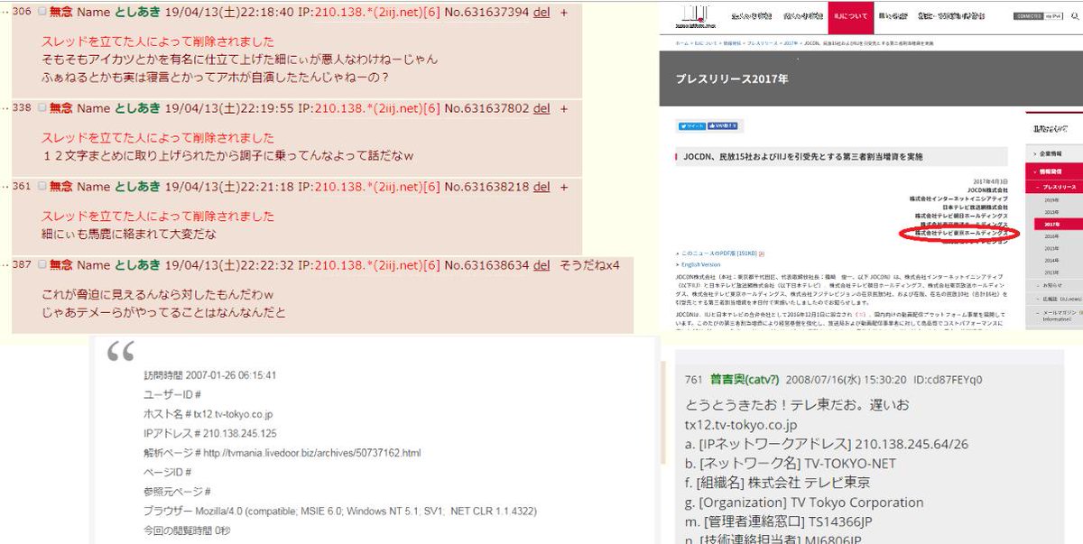 Shin Nosuke しばらく低浮上 در توییتر 拾い物ナ テレ東のipアドレスと某掲示板で 誹謗中傷繰り返してたユーザーの上位ipアドレスが一致 ふぁねる 細谷と思われる人物がテレ東のpcから 掲示板に誹謗中傷行為をしていた疑惑がかなり深まったナ