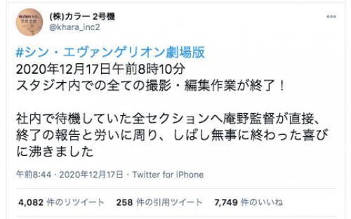 シン エヴァンゲリオン劇場版 の スタジオ内での全ての撮影 編集作業が終了 と 株 カラーがtwitterで報告 ニコニコニュース
