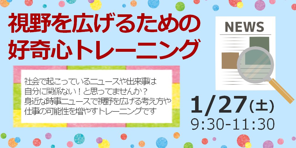 京都ジョブパーク 公式 على تويتر 1 27 土 視野を広げるための好奇心トレーニング Jpカレッジ 社会で起こっているニュース や出来事は自分に関係ない と思ってませんか 身近な時事ニュースで視野を広げる考え方や 仕事の可能性を増やすトレーニング