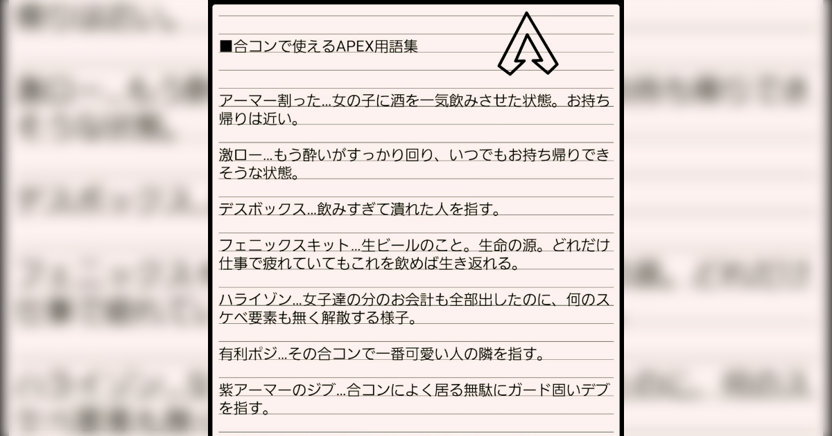 Apex界隈が盛り上がっている 合コンで使えるapex用語 女の子を酔わせてお持ち帰り などがありレイプ助長だと話題に Togetter ニュートピ Twitterで話題のニュースをお届け