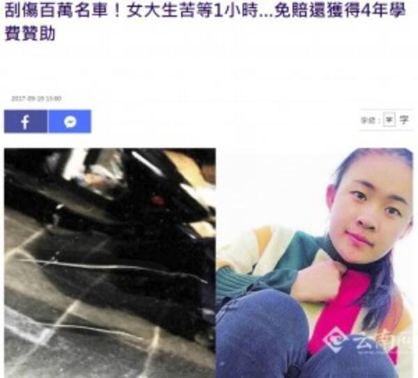 高級車にキズをつけてしまった女子大生 正直に謝罪し学費支援を得る 中国 2018年3月21日 エキサイトニュース