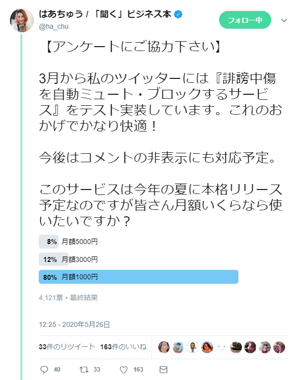 はあちゅう Twitterの誹謗中傷を自動でミュート ブロックするサービスを作った 月幾らなら使う ニコニコニュース