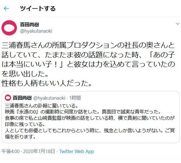 三浦春馬さんの訃報に百田尚樹さん 真面目で誠実な青年だった 人としても俳優としてもこれからという時に 残念としか言いようがない 2020年7月18日 エキサイトニュース