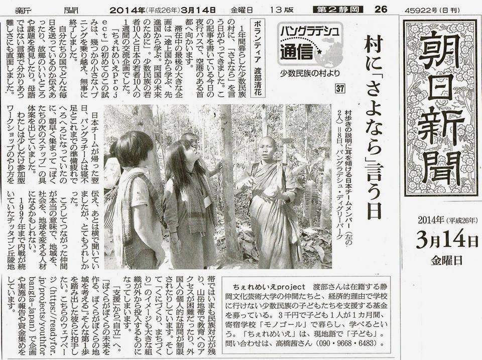 朝日新聞 バングラデシュ通信 少数民族の村より 3月 2014