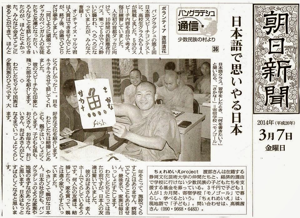 朝日新聞 バングラデシュ通信 少数民族の村より 第36回 日本語で思いやる日本