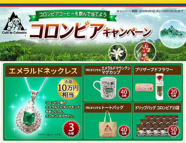 10万円相当のコロンビア産エメラルドネックレスをはじめ 合計153名様に豪華賞品が当たる コロンビアキャンペーン 開催 キャンペーン期間 2016年9月1日 木 10月31日 月 2016年9月1日 エキサイトニュース