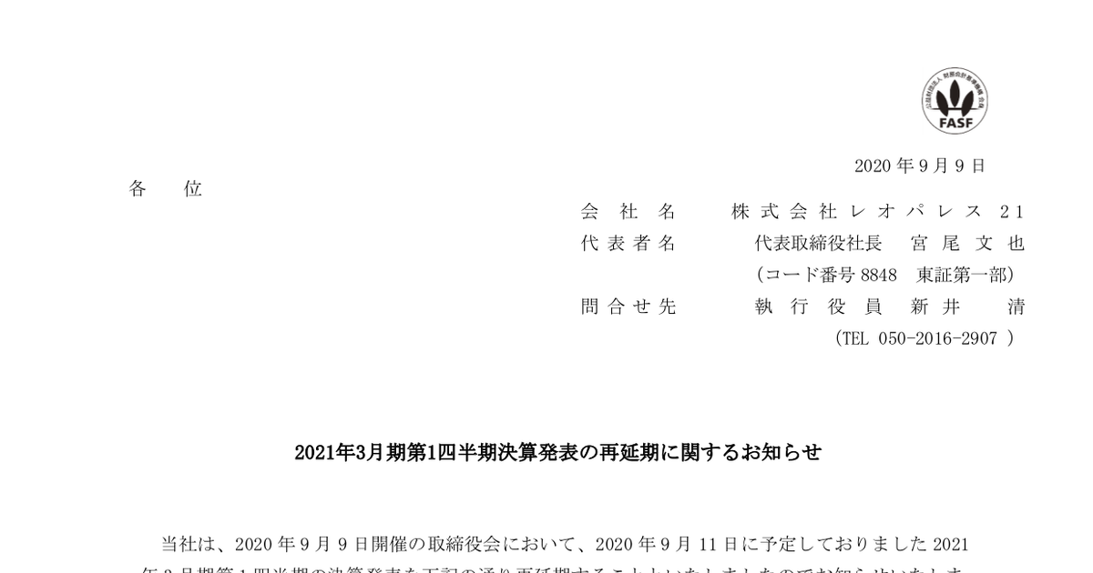 レオパレス21 8848 2021年3月期第1四半期決算発表の再延期に関するお知らせ 2020年9月9日 適時開示 日経会社情報digital 日本経済新聞 ニュートピ Twitterで話題のニュースをお届け