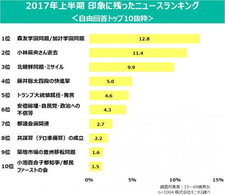 2017 年上半期で印象に残ったニュースランキング発表 10 位中 7 件が政治問題 選挙や不祥事に関心が集まる モニターズモニター15 歳 69 歳男女への意識調査 株式会社モニタス プレスリリース配信代行サービス ドリームニュース